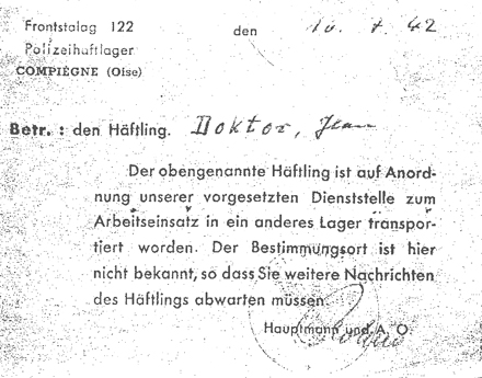 Le 4 novembre 1942, Madame Doktor dépose (avec Madame Scharf) une demande d’envoi de colis, que la Direction régionale des questions juives de Rouen transmet aux autorités allemande. Celles-ci répondent ignorer où se trouve son mari et lui demandent de s’adresser « à M. le directeur du camp de Compiègne. » La démarche est dans une impasse : en juillet, Madame Doktor avait reçu de Compiègne la carte imprimée en allemand indiquant : « Par décision de nos services, le détenu susnommé a été transféré dans un camp pour y travailler. Sa destination étant inconnue, il vous faudra attendre pour avoir de ses nouvelles. »