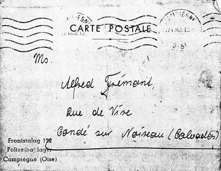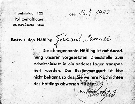 Le 6 juillet 1942 à l’aube, les détenus sont conduits à pied sous escorte allemande à la gare de Compiègne, sur la commune de Margny, et entassés dans des wagons de marchandises. Le train part une fois les portes verrouillées, à 9 h 30. Ce jour-là, Samuel Frémont envoie un dernier message à son frère Marcel, précisant qu’il a reçu en tout quatre colis à Compiègne : « La réclame dans les journaux pour aller travailler en Allemagne ne rend pas, sûrement. Alors l’on part de force dans des wagons à bestiaux ce matin à 1200. (…) Dans l’espoir que tu lises ma lettre un de ces jours, si je tombe sur un bon garçon obligeant. »