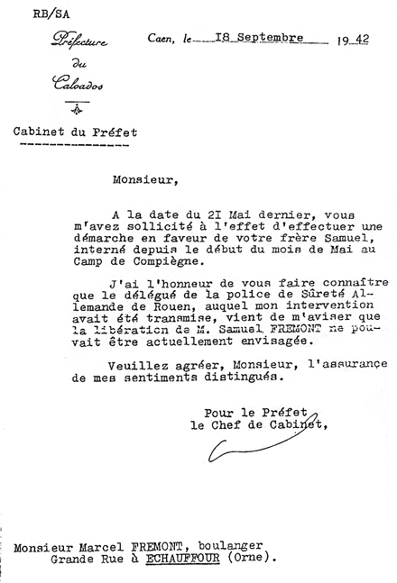 Le 18 septembre, suite à la demande de son frère Marcel, la préfecture du Calvados fait savoir que, selon les services de la sûreté allemande basés à Rouen, « la libération de M. Samuel Frémont ne pouvait être actuellement envisagée. »