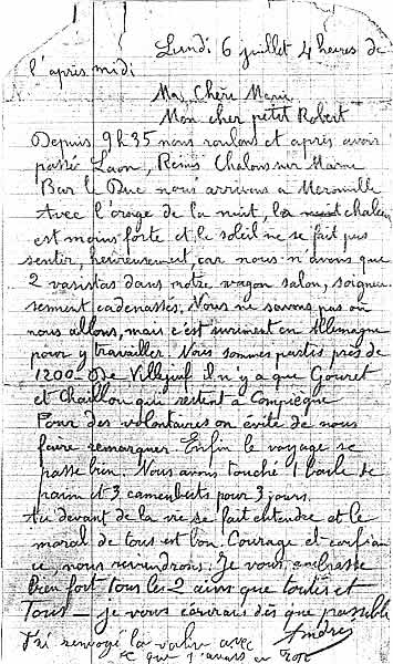 André Darondeau arrive à écrire et jeter sur la voie un mot qui parvient à sa sœur, Madame R. Hée, 8, avenue de Vitry (aujourd’hui avenue Louis-Aragon), à Villejuif : « Lundi 6 juillet, 4 heures de l’après-midi, Ma chère Marie, Mon cher petit Robert, Depuis 9 h 35 nous roulons et après avoir passé Laon, Reims, Châlons-sur-Marne, Bar-le-Duc, nous arrivons à Mérouville. Avec l’orage de la nuit, la chaleur est moins forte et le soleil ne se fait pas sentir, heureusement car nous n’avons que 2 vasistas dans notre wagon-salon, soigneusement cadenassés. Nous ne savons pas où nous allons, mais c’est sûrement en Allemagne pour y travailler. Nous sommes partis près de 1200. De Villejuif, il n’y a que Gouret et Chailloux qui restent à Compiègne. Pour des volontaires, on évite de nous faire remarquer [2]. Enfin le voyage se passe bien. Nous avons touché 1 boule de pain et 3 camemberts pour 3 jours. « Au devant de la vie » se fait entendre et le moral de tous est bon. Courage et confiance, nous reviendrons. Je vous embrasse bien fort tous les 2 ainsi que toutes et tous. je vous écrirai dès que possible.