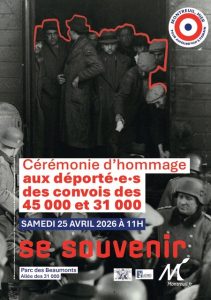 Cérémonies d’hommage aux déportés des convois des 45000 et 31000 Cliquer sur l’image pour l’agrandir 19 Avr 2026|Categories: Agenda| Share This Story, Choose Your Platform! FacebookXBlueskyRedditLinkedInWhatsAppTelegramTumblrXingEmailCopy Link Related Posts Mantes-la-Jolie, programme culturel inédit dédié à la mémoire de la Seconde Guerre Mondiale Mantes-la-Jolie, programme culturel inédit dédié à la mémoire de la Seconde Guerre Mondiale La Résistance au cinéma, 21ème festival de Seine-Saint-Denis La Résistance au cinéma, 21ème festival de Seine-Saint-Denis LILI TOUJOURS DEBOUT JUSQU’AU BOUT ! LILI TOUJOURS DEBOUT JUSQU’AU BOUT ! Cérémonie du 8 mars 2026 au Fort de Romainville Cérémonie du 8 mars 2026 au Fort de Romainville