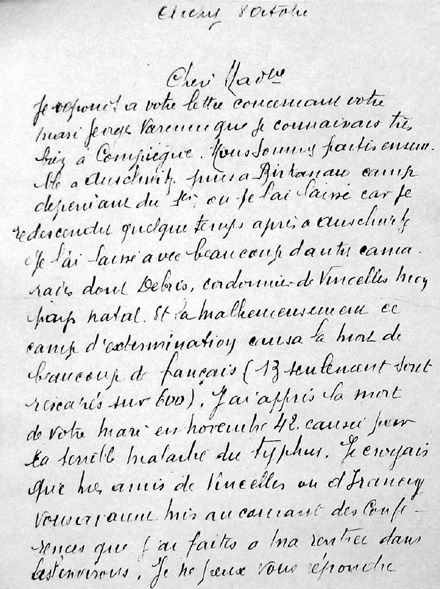 - Le 8 octobre (1945), René Petitjean écrit à l’épouse de Georges Varenne pour confirmer la disparition de celui-ci à Birkenau, en